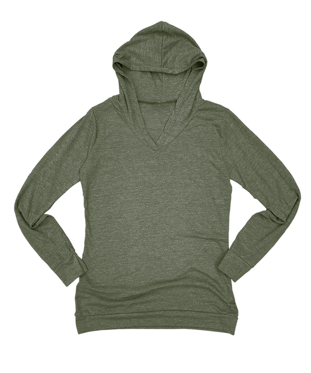 Heathered tri-blend of 50% polyester, 37% cotton, 13% rayon; solid is 60% cotton, 40% polyester